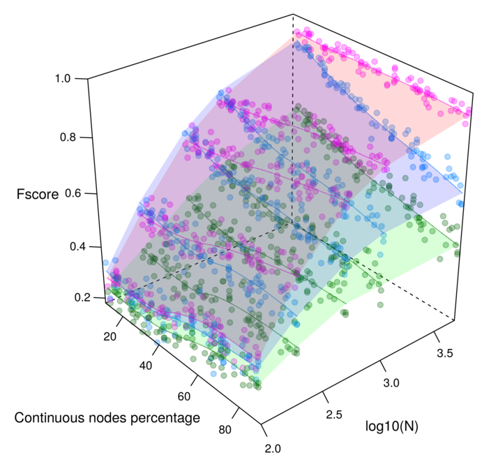 Figure 3. Reconstruction of benchmark networks for mixed-type non-gaussian datasets. F-scores obtained for 100 node random networks with average degree 3 reconstructed from N=10-10,000 samples. The parameter free Miic results (purple) are compared to alternative existing methods for mixed-type data: MXM (green) including one ajusting significance parameter (alpha) and CausalMGM (blue) including one ajusting regularization parameter (lambda). Cabeli et al (2020).