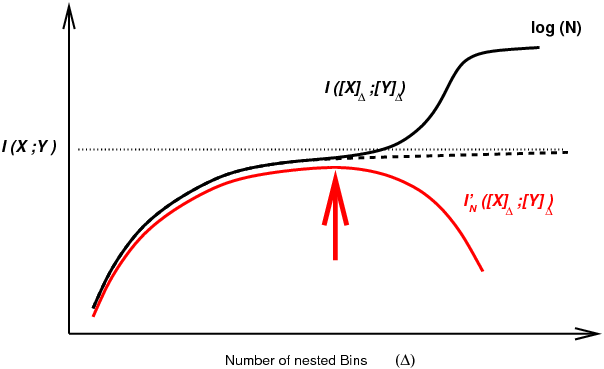 Figure 1. Mutual information computation between continuous or mixed-type variables for finite dataset. Arbitrary discretization of continuous variables tends to underestimate mutual information for small number of bins, while overestimating it for large number of bins due to limited number of samples. Alternatively, local metric approaches have been proposed to estimate mutual information (Kraskov 2004), based on k-nearest neighbor (kNN) statistics. However, the statistical significance of kNN information estimates remains difficult to assess in practice, thereby limiting their use to uncover (conditional) independences between continuous or mixed-type variables from real-life datasets. To circumvent this difficulty, we developed and implemented an efficient machine learning approach to simultaneously compute and assess the significance of multivariate information through an optimum partitioning of continuous variable(s) (red arrow) after introducing a complexity term to account for the finite size of the dataset, Cabeli et al (2020).