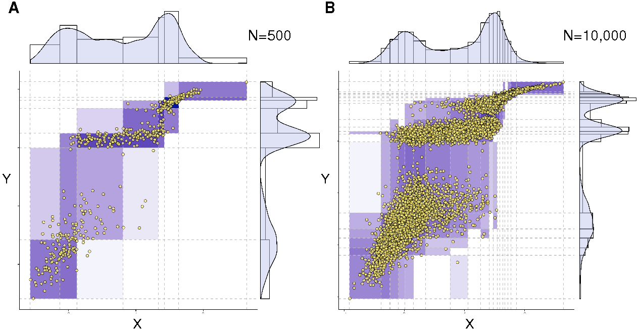Figure 2. Optimum bivariate discretization for mutual information estimate. The information-maximizing partition yields (A) I(X;Y)=1.042 for N=500 samples and (B) I(X;Y)=1.165 for N=10,000 samples, as compared to the exact expected value I(X;Y)=1.2, Cabeli et al (2020).