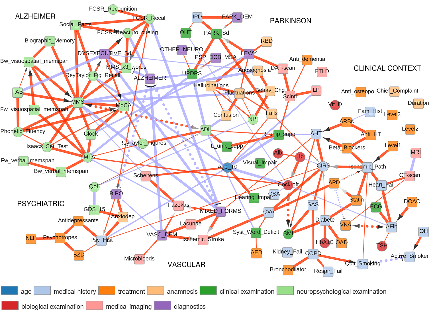 Beyond the different types and the heterogeneous nature of the recorded data, nodes of the reconstructed clinical network, Figure 4, can be grouped into clusters associated to specific dementia disorders and patient clinical context including comorbidities (diabetes, hypertension, etc) and related comedications. Diagnosis nodes in each cluster correspond to "explanatory" variables assessed by the neurologist. In particular, a number of "explaining-away effects" (Pearl 2009) in the form of v-structures, D1 -> S <- D2, can be identified, whereby alternative diagnoses, D1 or D2 , may independently explain a given syndrome (S) or the result of a specific examination. Moreover, beyond these v-structures, the actual direct and indirect relations between variables in each cluster are consistent with the state-of-the-art clinical practice to accurately diagnose each of these dementias. The global analysis recovers well known relations as well as novel direct and indirect relations between specific variables in these medical records. In particular, we uncover a direct relation between the demyelinization and axonal loss caused by cerebrovascular accidents (fazekas scale) and the atrophy of the hippocampus (Scheltens scale). This provides some physiological insights linking the consequence of vascular accidents to the atrophy of important brain structures associated to cognitive impairment.