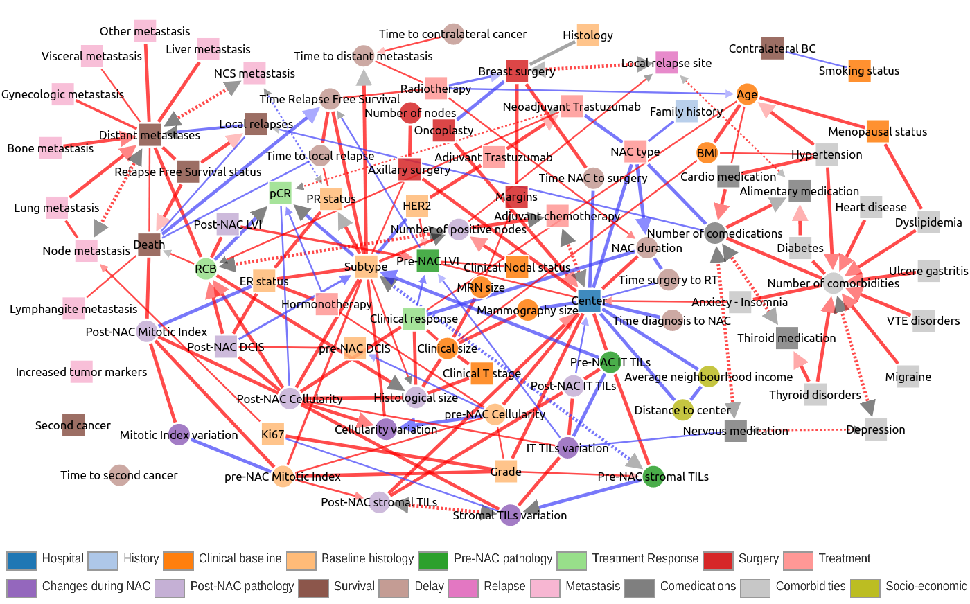 Application to medical records of breast cancer patients A second application concerns the reconstruction and interactive exploration of a clinical network obtained from analyzing the medical records of 1,197 breast cancer patients treated by neoadjuvant chemotherapy at Institut Curie Hospitals (Collaboration with Prof F Reyal). The dataset contains 89 variables of different types (ie 29 continuous and 60 categorical variables) and heterogeneous nature (ie variables related to comorbidities and comedications, clinical, biological examinations, chemotherapy, surgery and radiotherapy treatments). The resulting graphical model, Figure 5, visually captures the global interdependencies in these medical records without any a priori hypothesis between clinically relevant and other variables. In particular, Figure 5 recapitulates the typical clinical follow-up of breast cancer patients from early diagnosis to successive treatments and recovery or relapses, metastasis. Yet, unexpected associations and biases were also uncovered through the clinical network analysis, such as i) the significant effects of the hospital center (Paris or St Cloud) on patient clinical profile at diagnosis and subsequent clinical practice or ii) the importance of the variation of TILS responses to treatment on the prognosis of the disease.