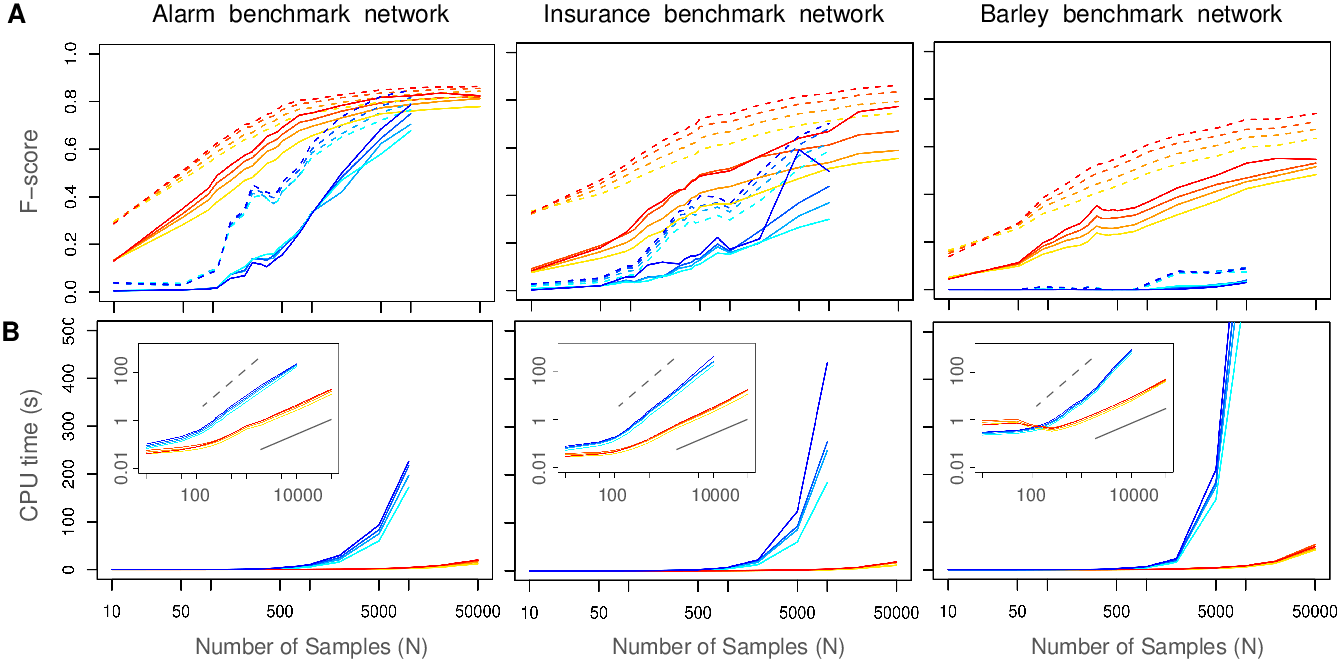 Figure 2. MIIC performance on benchmark networks. (A) F-score (harmonic mean of Precision and Recall) of miic algorithm (warm colors) for 0%, 5%, 10% and 20% of latent variables (top to bottom curves), compared to the RFCI algorithm (cold colors) on benchmark networks of increasing complexity disregarding (dashed lines) or including (solid lines) edge orientations: Alarm [37 nodes, avg. deg. 2.5, 509 parameters], Insurance [27 nodes, avg. deg. 3.9, 984 parameters] and Barley [48 nodes, avg. deg. 3.5, 114,005 parameters]. (B) Computation times of miic (warm colors) compared to RFCI (cold colors). Inserts: computation times in log scale showing a linear scaling (solid bar) for miic and a close to quadratic scaling (dashed bar) for RFCI in the limit of large datasets (Verny et al. 2017).