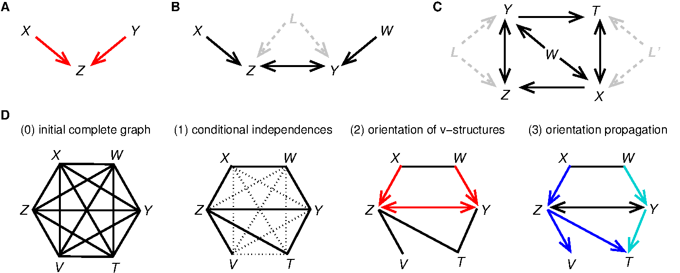 Figure 1. Learning causal networks with latent variables. (A) A v-structure. (B & C) Bidirected edges in 'ancestral graphs' indicate the presence of latent variable(s), \({\small L}\) or \({\small L^\prime}\), corresponding to common cause(s) unobserved in the dataset. (D) Outline of the successive algorithmic steps of constraint-based approaches (Verny et al. 2017).