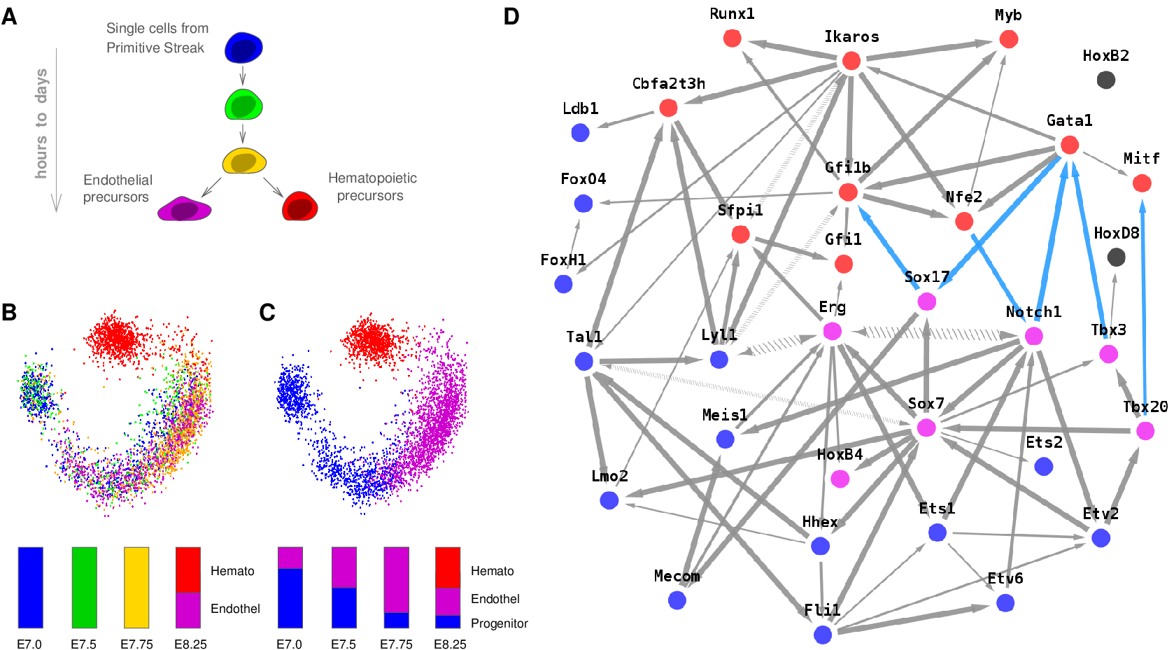 Figure 3. MIIC network reconstruction from single cell expression data. (A) Hematopoietic / endothelial differentiation in single cells from mouse embryos. (B) Principal component analysis and (C) K-means clustering of gene expression data with histograms showing the relative proportions of cell populations at each data point (E7.0 to E8.25). (D) Hematopoietic / endothelial differentiation regulatory network between hematopoietic specific (red), endothelial (violet), common (blue) and unclassified (gray) TFs predicted using MIIC (blue edges correspond to repressions), Verny et al. 2017.