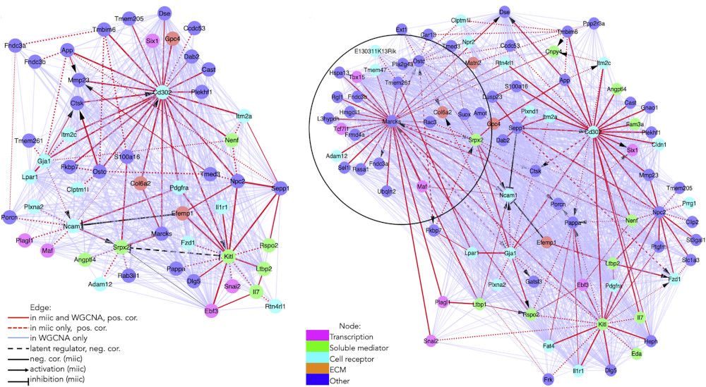 Figure 5. MIIC inferred regulatory networks in bone marrow hematopoietic stem cell-supporting stromal niche population. Gene regulatory networks of Leptin receptor-positive cell population at baseline (left, 1,712 cells) and under stress (right, 3,467 cells), uncovering several novel regulatory hubs around genes Kilt and Cd302 as well as around Marcks under stress conditions (Desterke et al. 2020). MIIC regulatory networks in red hightlight direct regulations between genes by contrast to WGCNA networks displaying both direct and indirect interactions based on gene-gene correlations (scRNAseq data from Tikhonova et al. Nature 2019).