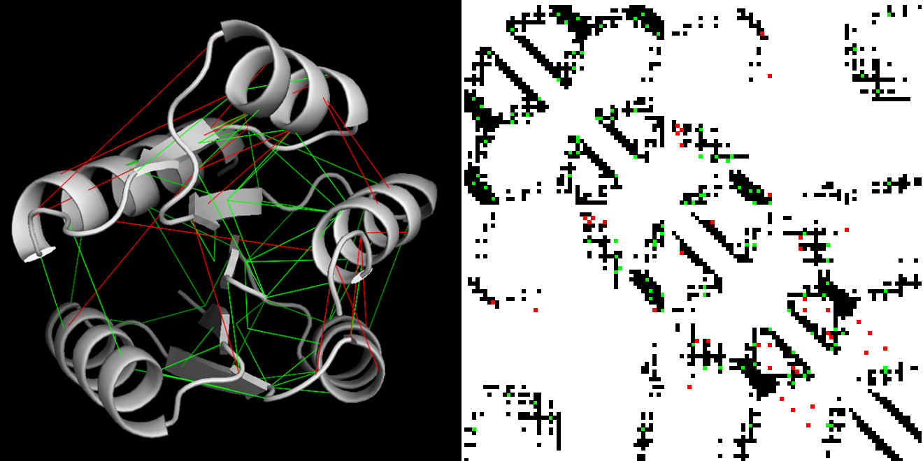 Figure 4. MIIC protein interaction map from amino acid homologous sequences. MIIC residue-residue contact predictions of the response regulator receiver domain (PF00072) mapped on an experimentally resolved structure (1nxs PDB). Contacts are defined as residues with a proximity of less than 8A. Left panel: protein 3D structure with correct predictions in green and apparent errors in red. Right panel: 2D contact map with experimental contacts in black and predictions with same color code as in the left panel (Sella et al. 2018).